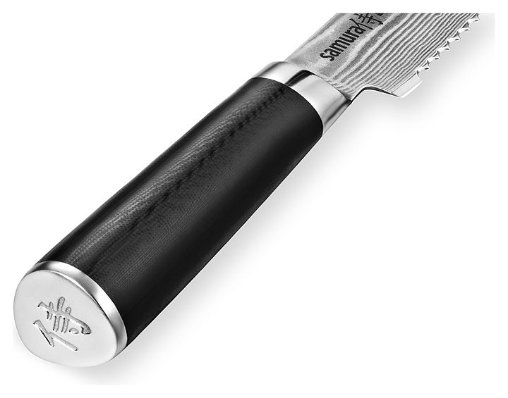 Нож для хлеба Samura Damascus SD-0055/Y предназначен для нарезки хлеба и хлебобулочных изделий на предприятиях общественного питания и торговли, в частных домах и квартирах. Центральная часть ножа выполнена из высококачественной дамасской стали V-Gold-10 и защищена 67 слоями обкладок из более мягких сталей - благодаря этому режущая кромка долго сохраняет безупречную остроту, а сердцевина надежно защищена от механических повреждений при работе. Ручка изготовлена из стеклопластика G-10. Особенности: