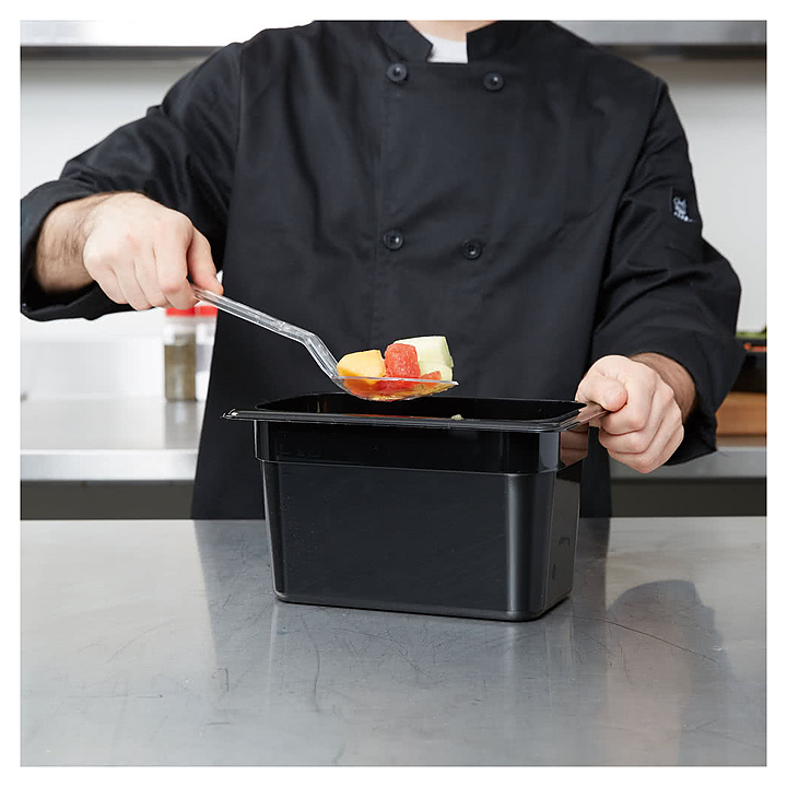 Гастроемкость Cambro 46CW 110 GN 1/4-150 используется на предприятиях общественного питания и торговли для приготовления широкого спектра блюд, демонстрации готовых блюд на линиях раздачи, заморозки, охлаждения и хранения продуктов в холодильных и морозильных шкафах, а также для транспортировки продуктов и готовых блюд. Изделие выполнено из высокопрочного поликарбоната Camwear®. Особенности: