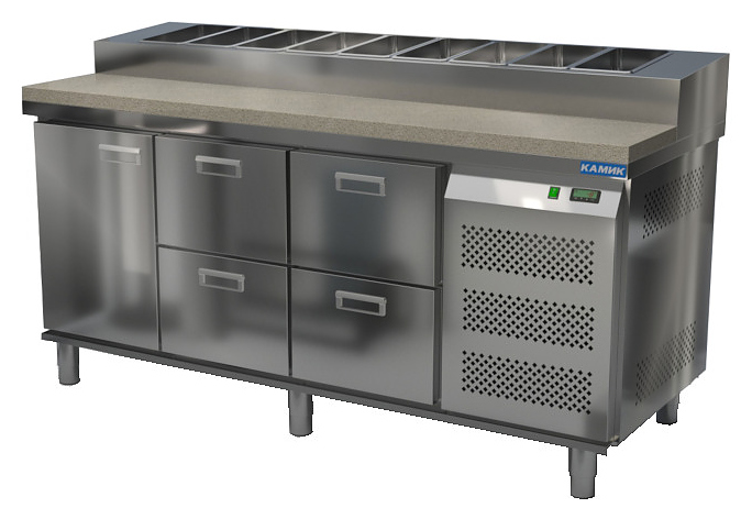 Холодильный стол КАМИК СОП-К-1418573 используется на предприятиях общественного питания и торговли для охлаждения и хранения продуктов, напитков и готовых блюд, а также для раскатки теста и обработки ингредиентов для приготовления пиццы. Конструкция разделена на секции, каждая секция с дверью оборудована сетчатой полкой и парой направляющих. Корпус выполнен из нержавеющей стали AISI 430 толщиной 1 мм, столешница - из камня. Особенности: