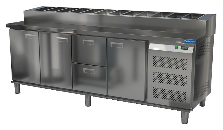 Холодильный стол КАМИК СОП-322373 используется на предприятиях общественного питания и торговли для охлаждения и хранения продуктов, напитков и готовых блюд, а также для раскатки теста и обработки ингредиентов для приготовления пиццы. Конструкция разделена на секции, каждая секция с дверью оборудована сетчатой полкой и парой направляющих. Корпус выполнен из нержавеющей стали AISI 430 толщиной 1 мм, столешница - из нержавеющей стали AISI 304 толщиной 1 мм. Особенности: