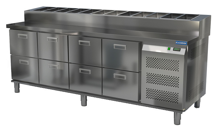 Холодильный стол КАМИК СОП-082373 используется на предприятиях общественного питания и торговли для охлаждения и хранения продуктов, напитков и готовых блюд, а также для раскатки теста и обработки ингредиентов для приготовления пиццы. Конструкция разделена на секции, каждая из которых оборудована сетчатой полкой и парой направляющих. Корпус выполнен из нержавеющей стали AISI 430 толщиной 1 мм, столешница - из нержавеющей стали AISI 304 толщиной 1 мм. Особенности: