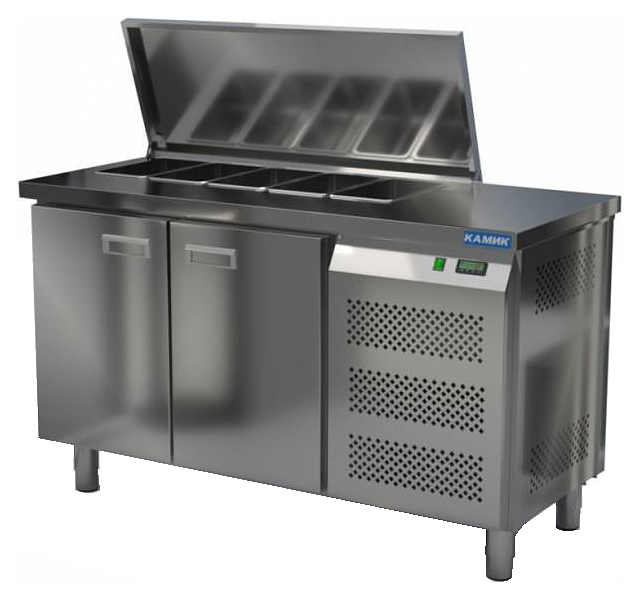 Холодильный стол КАМИК СОН-201466К используется на предприятиях общественного питания и торговли для охлаждения, демонстрации и кратковременного хранения ингредиентов для приготовления салатов, напитков и готовых блюд. Конструкция разделена на секции, каждая секция с дверью оборудована сетчатой полкой и парой направляющих. Корпус выполнен из нержавеющей стали AISI 430 толщиной 1 мм, столешница - из нержавеющей стали AISI 304 толщиной 1,5 мм. Особенности: