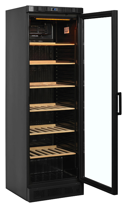 Винный шкаф TEFCOLD CPV1380 создает оптимальные условия для сохранения всех вкусовых свойств вина в барах, ресторанах, специализированных магазинах, частных домах или квартирах. Внутренняя обшивка выполнена из черного ABS-пластика. Особенности: