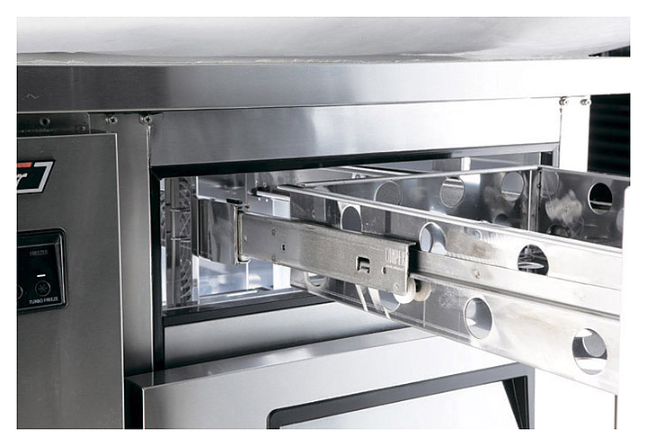 Холодильный стол Turbo air KUR18-3D-6 предназначен для раскатки теста, обработки, охлаждения и кратковременного хранения продуктов и напитков на предприятиях общественного питания и торговли. Модель оснащена 2 ящиками GN 1/1 глубиной 100 мм и 1 полкой и 6 регулируемыми ножками. Корпус выполнен из нержавеющей стали (гальванизированная сталь на оборотной стороне и внизу) с применением пожаробезопасных стенок толщиной 60 мм, уплотнения - из АБС-пластика (акрилонитрилбутадиенстирола), не пропускающего конденсата, пол - из нержавеющей стали с алюминиевыми вставками по бокам и сзади оборудования, тройные направляющие - из высококачественной нержавеющей стали. Особенности: