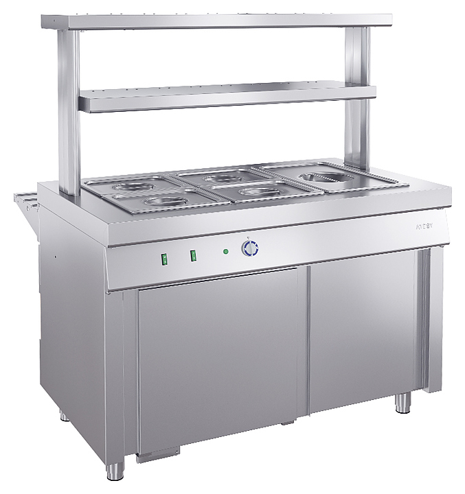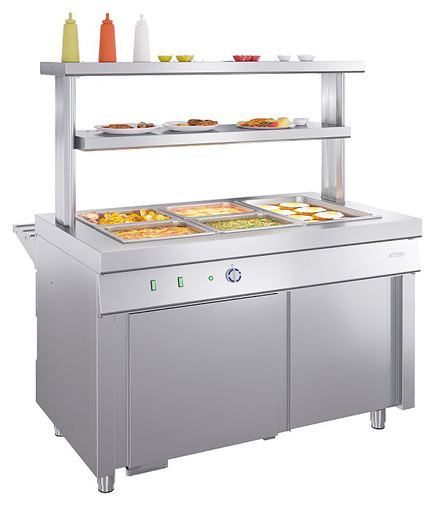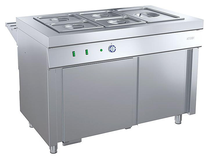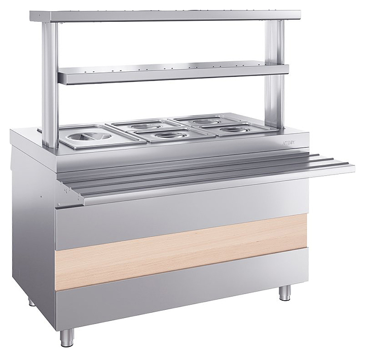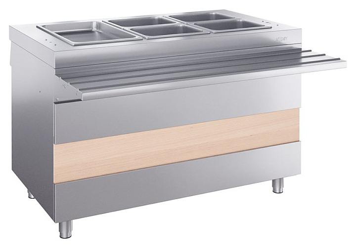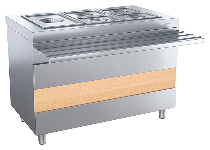 Мармит ATESY Ривьера М2-1120-02-СО используется в составе линии раздачи Ривьера на предприятиях общественного питания и торговли для поддержания в горячем состоянии гастроемкостей со вторыми блюдами, гарнирами и соусами. Модель оснащена герметичной ванной для размещения гастроемкостей и терморегулятором, позволяющим осуществлять настройку температуры нагрева гастроемкостей. Столешница выполнена из нержавеющей стали AISI 430 и усилена листом ламинированной ДСП толщиной 16 мм, ванна - из нержавеющей стали, ножки - из нержавеющей стали и пластиковой опорной части. В комплект поставки входят 2 съемные перемычки из нержавеющей стали П-образной формы, позволяющие устанавливать гастроемкости формата GN 1/2 и GN 1/3, направляющая для подносов и съемная декоративная панель цвета и текстуры D2413 Дуб. Гастроемкости в комплект поставки не входят и приобретаются отдельно. Особенности: