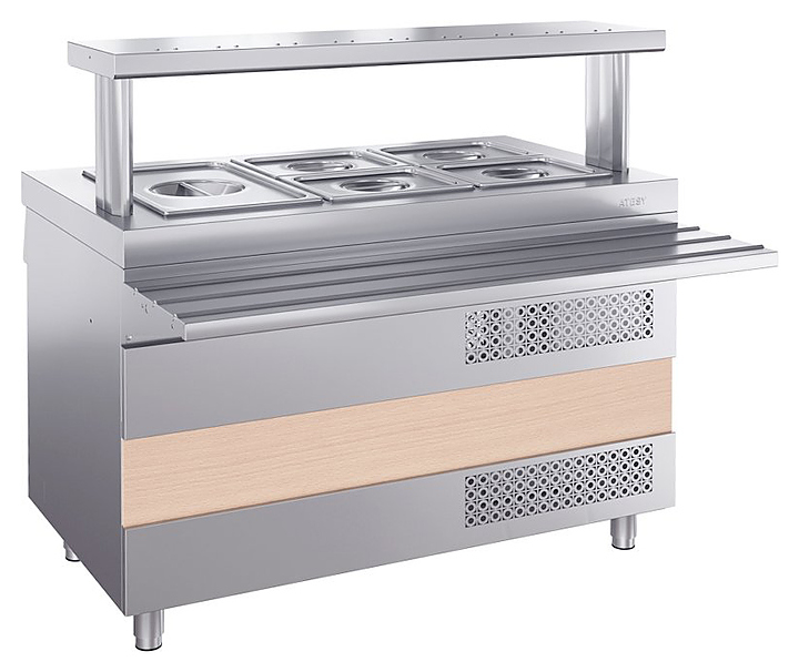 Охлаждаемый стол ATESY Ривьера ОС-1120-02-О используется в составе линии раздачи Ривьера на предприятиях общественного питания и торговли для кратковременного хранения и раздачи холодных напитков, салатов, кисломолочных продуктов и других блюд, требующих хранения в охлажденном состоянии. Модель оснащена герметичной ванной для размещения гастроемкостей или напитков и продуктов в фабричной упаковке, а также тарелок с уже сервированными блюдами непосредственно на дне ванны. Столешница выполнена из нержавеющей стали AISI 430 и усилена листом ламинированной ДСП толщиной 16 мм, ванна - из нержавеющей стали, ножки - из нержавеющей стали и пластиковой опорной части. В комплект поставки входят 2 съемные перемычки из нержавеющей стали П-образной формы, позволяющие устанавливать гастроемкости формата GN 1/2 и GN 1/3, направляющая для подносов и съемная декоративная панель цвета и текстуры D2413 Дуб. Гастроемкости в комплект поставки не входят и приобретаются отдельно. Особенности:
