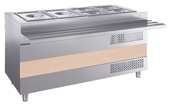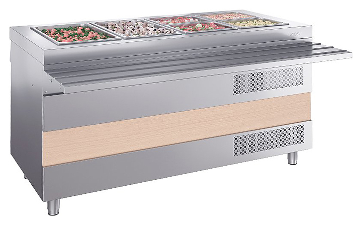 Охлаждаемый стол ATESY Ривьера ОС-1500-02 используется на предприятиях общественного питания и торговли для кратковременного хранения и раздачи холодных напитков, салатов, кисломолочных продуктов и других блюд, требующих хранения в охлажденном состоянии. Модель оснащена герметичной ванной для размещения гастроемкостей или напитков и продуктов в фабричной упаковке, а также тарелок с уже сервированными блюдами непосредственно на дне ванны. Столешница выполнена из нержавеющей стали AISI 430 и усилена листом ламинированной ДСП толщиной 16 мм, ванна - из нержавеющей стали, ножки - из нержавеющей стали и пластиковой опорной части. В комплект поставки входят 3 съемные перемычки из нержавеющей стали П-образной формы, позволяющие устанавливать гастроемкости формата GN 1/2 и GN 1/3, направляющая для подносов и съемная декоративная панель цвета и текстуры D2413 Дуб. Гастроемкости в комплект поставки не входят и приобретаются отдельно. Особенности:
