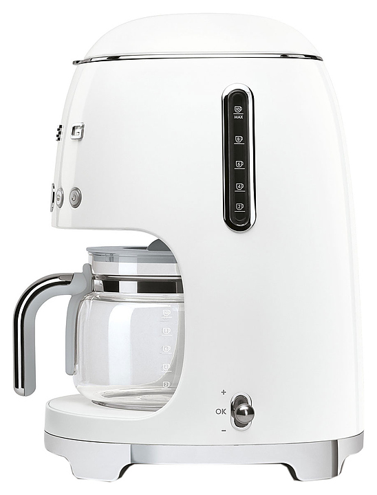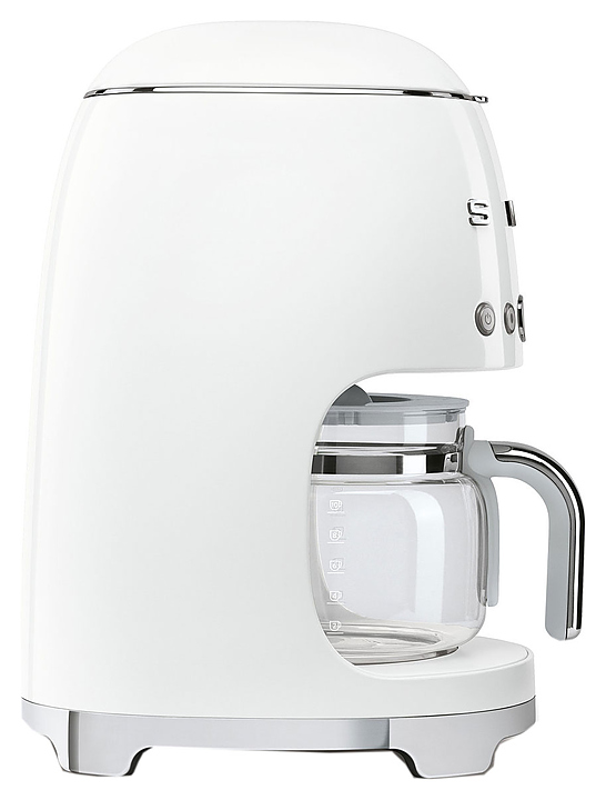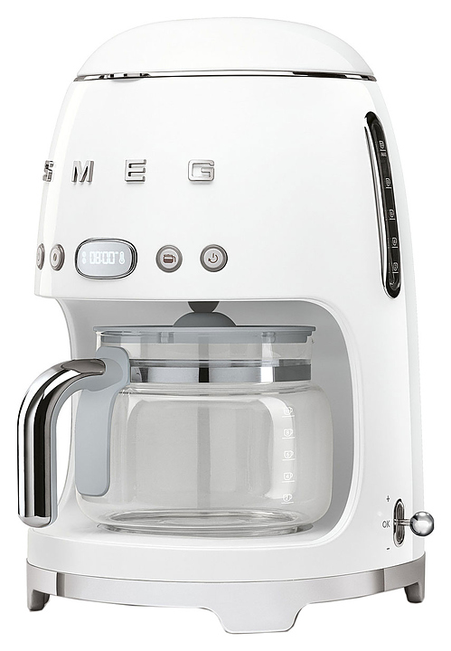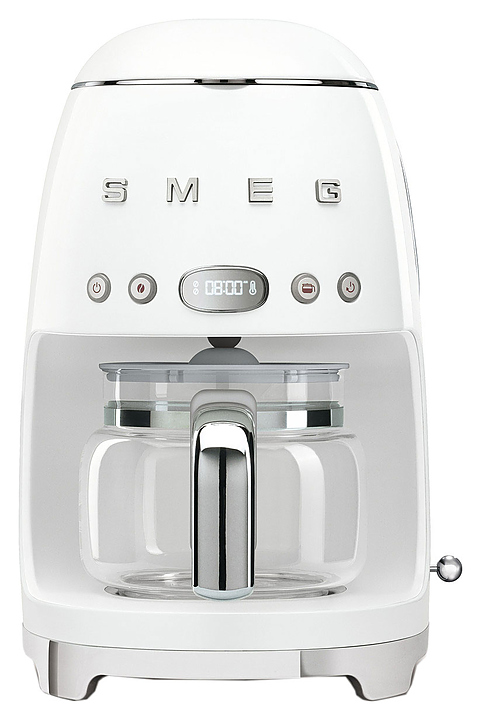Кофеварка Smeg DCF02WHEU предназначена для приготовления кофейных напитков в частных домах и квартирах. Модель выполнена в стиле 50-х годов. Корпус изготовлен из окрашенного металла. В комплект поставки входят стеклянный кувшин для кофе на 10 чашек с ручкой и крышкой, многоразовый фильтр с ручкой и мерная ложка для молотого кофе. Особенности: