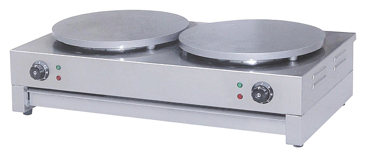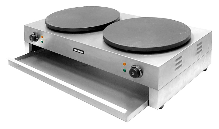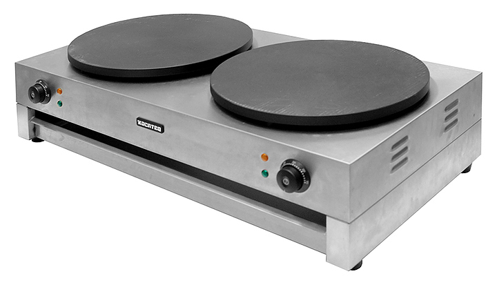 Блинница Kocateq JB2PNW используется на предприятиях общественного питания и торговли, в пекарнях и кондитерских. Модель оснащена механическими термостатами для регулировки температуры. Корпус выполнен из нержавеющий стали AISI 430 толщиной 0,8 мм, круглые жарочные поверхности - из теплопроводной низкоуглеродистой стали толщиной 20 мм с покрытием из тефлона. Особенности: