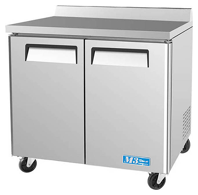 Холодильный стол Turbo air CMWR-36 предназначен для раскатки теста, обработки, охлаждения и кратковременного хранения продуктов и напитков на предприятиях общественного питания и торговли. Корпус выполнен из нержавеющей стали (гальванизированная сталь на оборотной стороне и внизу) с применением пожаробезопасных стенок толщиной 60 мм, уплотнения - из АБС-пластика, пол - из нержавеющей стали с алюминиевыми вставками по бокам и сзади оборудования, регулируемые полки - из толстой стальной проволоки с виниловым покрытием. Особенности: