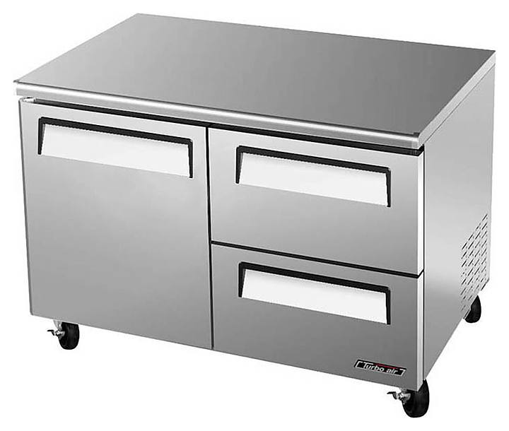 Холодильный стол Turbo air CMUR-48-2D-2 предназначен для раскатки теста, обработки, охлаждения и кратковременного хранения продуктов и напитков на предприятиях общественного питания и торговли. Корпус выполнен из нержавеющей стали (гальванизированная сталь на оборотной стороне и внизу) с применением пожаробезопасных стенок толщиной 60 мм, уплотнения - из АБС-пластика, пол - из нержавеющей стали с алюминиевыми вставками по бокам и сзади оборудования, регулируемые полки - из толстой стальной проволоки с виниловым покрытием, тройные направляющие - из высококачественной нержавеющей стали. Особенности: