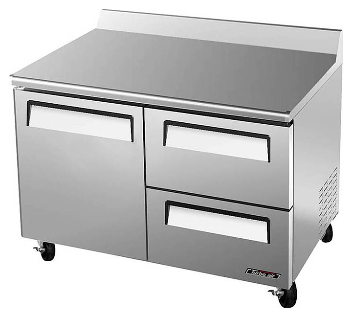 Холодильный стол Turbo air CMWR-48-2D-2 предназначен для раскатки теста, обработки, охлаждения и кратковременного хранения продуктов и напитков на предприятиях общественного питания и торговли. Корпус выполнен из нержавеющей стали (гальванизированная сталь на оборотной стороне и внизу) с применением пожаробезопасных стенок толщиной 60 мм, уплотнения - из АБС-пластика, пол - из нержавеющей стали с алюминиевыми вставками по бокам и сзади оборудования, регулируемые полки - из толстой стальной проволоки с виниловым покрытием, тройные направляющие - из высококачественной нержавеющей стали. Особенности: