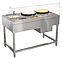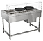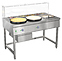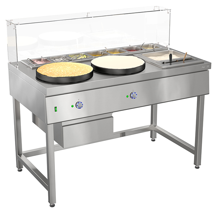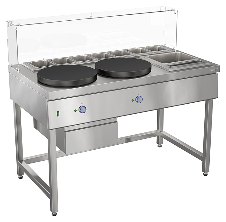 Блинная станция ATESY Лакомка БС-2.400-1350.750-02 используется на предприятиях общественного питания и торговли для комплексного оснащения рабочего места приготовления и раздачи блинов с начинкой. Модель оснащена двухконфорочным электрическим блинным аппаратом и съемными гастронормированными холдерами для размещения емкостей с тестом и начинками. Корпус выполнен из коррозинностойкой стали, стойки каркаса - из нержавеющей трубы сечением 40x40 мм, конфорки - из чугуна. В комплект поставки входят деревянная лопатка для распределения теста и металлическая лопатка для переворачивания блинов. Особенности: