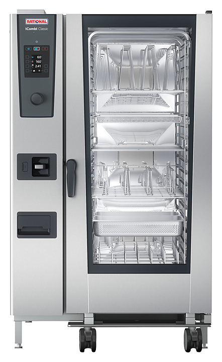 Пароконвектомат Rational iCombi Classic 20-2/1 предназначен для приготовления блюд путём жарки, тушения или варения на предприятиях общественного питания и торговли. Такое оборудование может заменить плиту, жарочный и духовой шкаф, конвекционную печь, опрокидывающуюся сковороду, пищеварочный котел и др. Модель оснащена цветным TFT-дисплеем с мягкими кнопками и поворотным регулятором с функцией Push.
