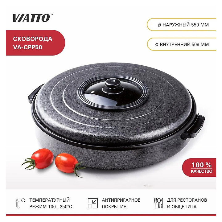 Электрическая сковорода VIATTO VA-CPP50 предназначена для приготовления пиццы, а также жарки, тушения и разогрева широкого блюд на предприятиях общественного питания и торговли. Модель оснащена терморегулятором и имеет антипригарное покрытие. Дополнительные характеристики: