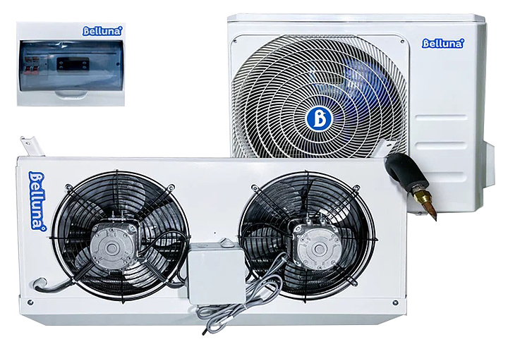 Холодильная сплит-система Belluna U102 серии Универсал предназначена для поддержания необходимого температурного режима в холодильных камерах на предприятиях пищевой промышленности, общественного питания и торговли. Холодильная машина состоит из внутреннего блока-воздухоохладителя и наружного блока. Для работы сплит-системы толщина пенополиуретановых панелей в холодильной камере должна быть не менее 80 мм. Особенности: