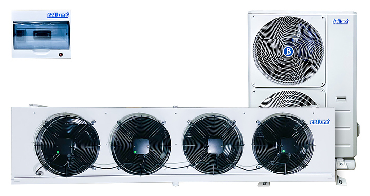 Холодильная универсальная сплит-система Belluna iP-5 предназначена для поддержания необходимого температурного режима в холодильных камерах на предприятиях пищевой промышленности, общественного питания и торговли. Инверторный компрессор с переменной производительностью от 30 до 100 % с отделителем жидкости позволяет поддерживать температуру с точностью до 0,5 °С, а также обеспечивает бесшумную работу. Холодильная машина состоит из наружного блока, внутреннего блока и щита управления. Для работы сплит-системы толщина пенополиуретановых панелей в холодильной камере должна быть не менее 80 мм. Особенности: