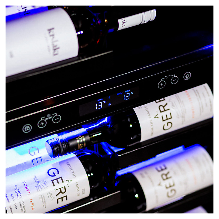 Винный шкаф Dunavox DX-104.375DSS предназначен для демонстрации, хранения и создания оптимальных условий для сохранения всех вкусовых свойств вина в бутылках на предприятиях общественного питания, торговли, в барах, ресторанах, специализированных магазинах, частных домах или квартирах. Модель оснащена сенсорной панелью управления, электронным термостатом, сигнализатором открытой двери и трехцветной LED-подсветкой (Red, Green, Blue) в каждой зоне. Корпус выполнен из окрашенного металла, дверь - из бесшовной нержавеющей стальной рамы и тонированного стекла с защитой от ультрафиолетовых лучей,полки - из пластифицированного металла, ручка двери - из стали. Особенности:
