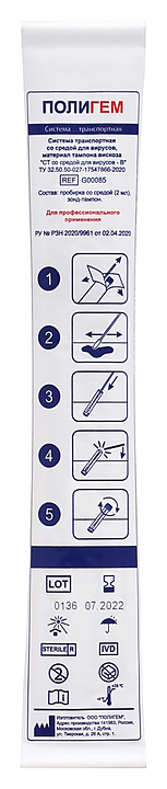 Набор из пипетки и зонда-тампона Полигем для теста XEMA SARS-CoV-2 CoviNAg предназначен для проведения экспресс-теста на COVID-19 XEMA SARS-CoV-2 CoviNAg. Зонд-тампон позволяет осуществлять забор образца с носоглотки пациента, пробирка с транспортной средой предназначена для хранения и транспортировки полученного биоматериала, а одноразовая пипетка делает возможным добавление тестируемых образцов в окошко тестовой кассеты. В комплект поставки входят 20 медицинских полимерных пипеток и 20 транспортных систем с зондом-тампоном и средой для вирусов. Особенности: