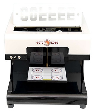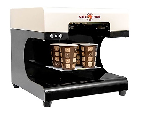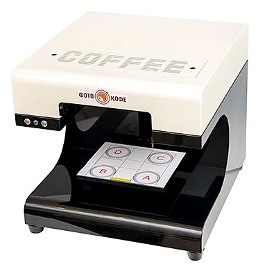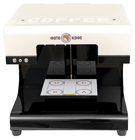 Кофе-принтер ФотоКофе премиум-класса предназначен для печати любых изображений, текста и фото поверх слоя пены кофейных напитков, молочных коктейлей, пива и на поверхности десертов в кофейнях, кафе, ресторанах и других предприятиях общественного питания и торговли. Корпус выполнен из металла. В комплект поставки входит планшет Android с установленным ПО, комплект картриджей и пищевых чернил на 3000 чашек и большая эксклюзивная коллекция картинок. Особенности: