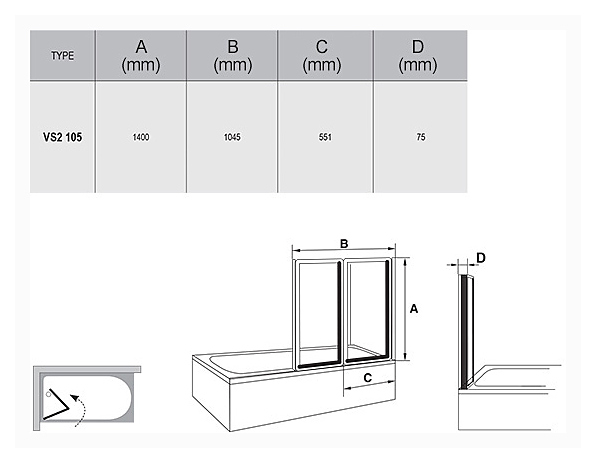Шторка Ravak VS2 предназначена для установки с ваннами. Модель состоит из двух подвижных частей, которые складываются вовнутрь ванны. Перевернув изделие на 180°, получится левый или правый варианты установки. Шторка отличается простым монтажом и можно устанавливать уже в готовую ванную комнату. Витражи выполнены из пластика Rain. Шторка подходит для прямоугольных ванн RAVAK City, Formy 01/02, 10°, Classic, Campanula II, Vanda II, Chrome, Domino или для любой классической прямоугольной ванны с ровным передним бортом. Особенности: