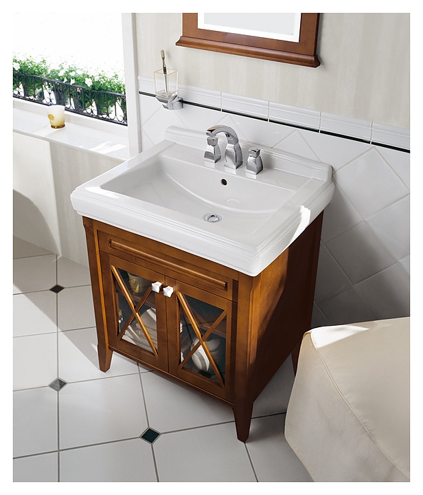 Тумба под раковину Villeroy & Boch Hommage 89950001 классических форм элегантно впишется в интерьер Вашего дома. Напольная конструкция позволяет установить тумбу без помощи специалистов, а высокие ножки не мешают уборке. У тумбы две дверцы со стеклом, а внутри полка для хранения необходимых мелочей. В комплект поставки входит крепежный коплект. Раковина в комплект поставки не входит. Тумба используется вместе с раковинами 710175R1. Дополнительные характеристики: