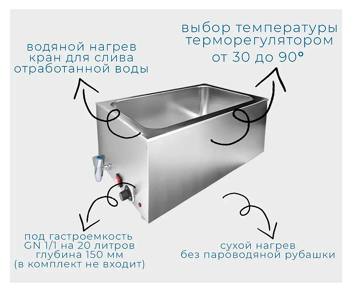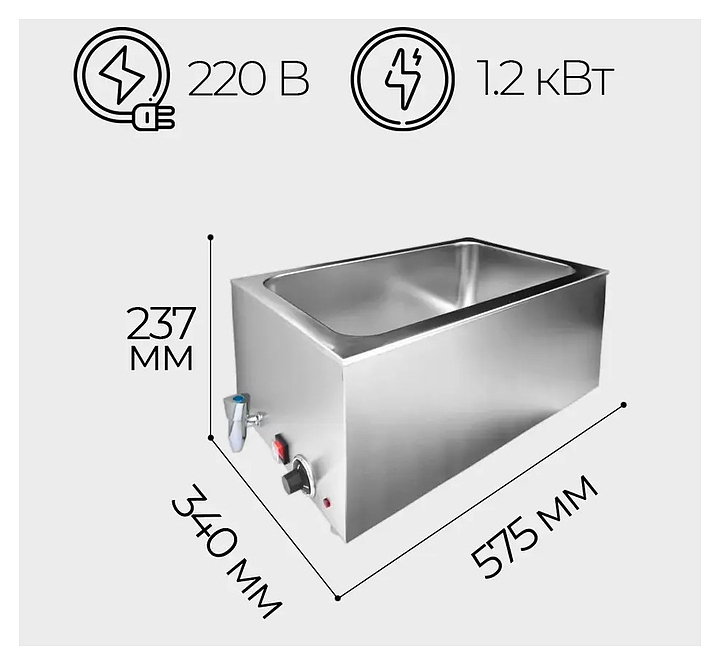 Мармит VIATTO ZCK165B предназначен для поддержания в горячем состоянии вторых блюд, гарниров и соусов на предприятиях общественного питания. Модель оснащена терморегулятором. Подогрев на водяном пару обеспечивает равномерный нагрев емкостей без пересушивания и пригорания подогреваемых блюд. Корпус выполнен из нержавеющей стали. Гастроемкость в комплект не входит. Дополнительные характеристики: