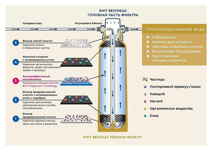 Стартовый комплект BWT Bestmax PREMIUM XL используется на предприятиях общественного питания и торговли для фильтрации воды, используемой в кофемашинах, вендинговых аппаратах и другом борудовании HoReCa для приготовления напитков, а также защиты его от известковых отложений. Многоступенчатая очистка обеспечивает необходимое качество воды для приготовления блюд и напитков и удаление всех примесей. Перед использованием фильтра необходим пролив несколькими литрами воды в дренаж (количество литров согласно инструкции). Комплектация: