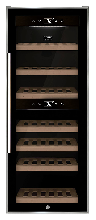Винный шкаф CASO WineComfort 38 black предназначен для охлаждения и длительного хранения бутилированного и разливного вина в частных домах, квартирах, отелях и офисах. Модель оснащена 2 зонами хранения с независимой установкой температуры и отдельной сенсорной панелью управления для каждой из них, 7 деревянными выдвижными полками. Корпус и ручка выполнены из нержавеющей стали, дверца - из трехслойного стекла с УФ-фильтром. Особенности: