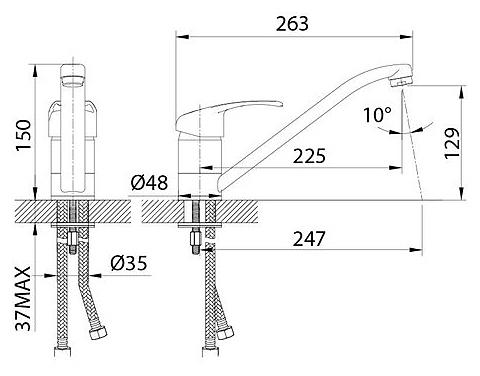 • Подключение к системе водоснабжения гибкой подводкой из нетоксичной EPDM резины в оплетке из нержавеющей стали, М10 - 1/2, длина 350 мм