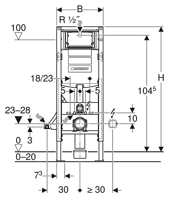 Система инсталляции с бачком Geberit Duofix 111.350.00.5 предназначена для монтажа подвесных унитазов с вылетом до 70 см. Модель представляет собой настенную опорную раму с бачком и регулируемыми по высоте ножками. Инсталляция подходит для гипсокартонных стен, для встраивания в пристенки по высоте рамы или по высоте помещения, для встраивания в фальшстены по высоте помещения, для встраивания в перегородку систем Geberit Duofix по высоте рамы или помещения, для одинарного, двойного смыва или смыва смыв-стоп. Рама подготовлена для крепления крепежных скоб для установки нестандартного санфаянса. Монтаж и сервисное обслуживание смывного бачка скрытого монтажа не требуют использования инструментов. Рама выполнена из стали с антикоррозиийным порошковым напылением. В комплект поставки входят подвод воды R 1/2", совместимый с MF, со встроенным угловым запорным вентилем и маховичком, защитная крышка для окна технического обслуживания, защитные заглушки, комплект для подключения унитаза, соединительное колено, переходная муфта, резьбовые шпильки и набор крепежей. Панель смыва не входит в комплект поставки и приобретается отдельно. Особенности: