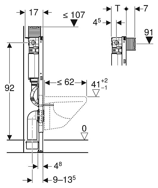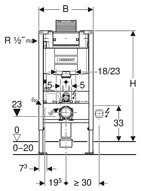 Система инсталляции с бачком Geberit Omega 111.030.00.1 предназначена для монтажа подвесных унитазов с вылетом до 62 см. Модель представляет собой настенную опорную раму с бачком и регулируемыми по высоте ножками. Инсталляция подходит для гипсокартонных стен, для встраивания в пристенки по высоте рамы, для встраивания в перегородку системы Geberit Duofix по высоте рамы. Защитная крышка окна технического обслуживания, с возможностью укорачивания, защищает от влаги и грязи. Монтаж и сервисное обслуживание смывного бачка скрытого монтажа не требуют использования инструментов. Рама выполнена из стали с антикоррозиийным порошковым напылением. В комплект поставки входят подвод воды R 1/2", совместимый с MF, со встроенным угловым запорным вентилем и маховичком, защитная крышка для окна технического обслуживания, комплект для подключения унитаза, соединительное колено, переходная муфта, резьбовые шпильки, защитные заглушки и набор крепежей. Панель смыва не входит в комплект поставки и приобретается отдельно. Особенности: