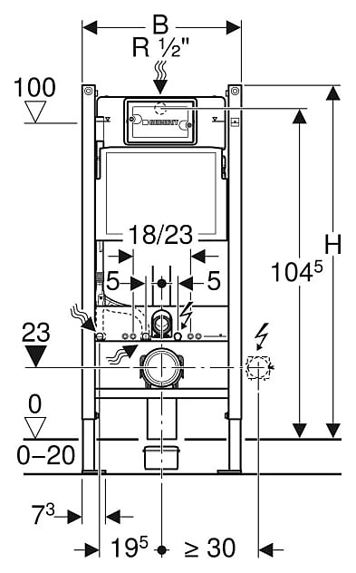 Система инсталляции с бачком Geberit Delta 111.153.00.1 предназначена для монтажа подвесных унитазов с вылетом до 62 см. Модель представляет собой настенную опорную раму с бачком и регулируемыми по высоте ножками. Инсталляция подходит для гипсокартонных стен, для встраивания в пристенки по высоте рамы или по высоте помещения, для встраивания в фальшстены по высоте помещения, для одинарного, двойного смыва или смыва смыв-стоп. Рама подготовлена для крепления крепежных скоб для установки нестандартного санфаянса. Рама выполнена из стали с антикоррозиийным порошковым напылением. В комплект поставки входят угловой запорный вентиль R 1/2", совместим с MF, с кольцом-адаптером, защитная крышка для окна технического обслуживания, 2 держателя крепления рамки, комплект для подключения унитаза, соединительное колено, переходная муфта, резьбовые шпильки, защитные заглушки и набор крепежей. Панель смыва не входит в комплект поставки и приобретается отдельно. Особенности: