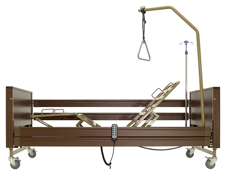 Медицинская кровать электрическая Med-Mos YG-1 (КЕ-4024М-21) коричневая с РУ используется в учреждениях здравоохранения для более комфортного пребывания в больнице лежачих больных с проблемами опорно-двигательного аппарата и пациентов, которые проходят процесс реабилитации после перенесенных операций или тяжелых заболеваний. Модель оснащена пластиковыми торцевыми элементами на боковых ограждениях, индикатором режима работы и индикатором заблокированного/разблокированного состояния на пульте управления пациента. Ложе и каркас выполнены из сварных конструкций из профильных труб из высокопрочной стали, покрытых ударопрочной эпоксидной эмалью, ограничители - из стального прутка, поперечины - из высокопрочных деревянных ламелей, торцевые спинки - из стального каркаса с облицовкой из массива бука, боковые ограждения - из алюминиевого профиля, покрытого декоративной пленкой под дерево, колеса - из полиуретана, дуга для подтягивания и инфузионная стойка - из нержавеющей стали с элементами из пластика. Кровать поставляется с регистрационным удостоверением Минздрава РФ. Комплектация: