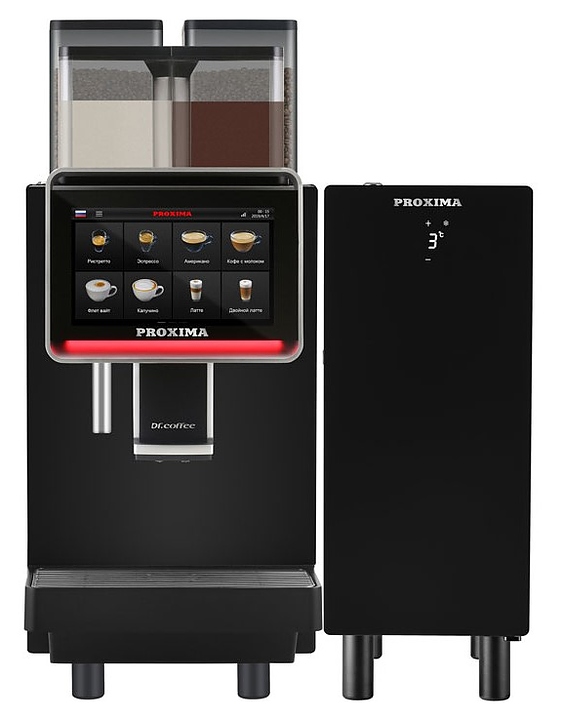 Кофемашина Dr.coffee Proxima F2 Plus используется на предприятиях общественного питания и торговли, в офисах, а также в домашних условиях для приготовления кофе и кофейных напитков. Модель оснащена графическим сенсорным дисплеем с блокировкой функции изменения параметров напитков для пользовательского меню. Жернова кофемолки выполнены из керамики, бойлер - из алюминия, контейнеры, каплесборник, заварное устройство - из пластика. В комплект поставки входят 2 контейнера для зерен, контейнер для горячего шоколада, контейнер для сухого молока, кабель, гаечный ключ для настройки степени помола, шланги забора воды и водоотвода. Особенности: