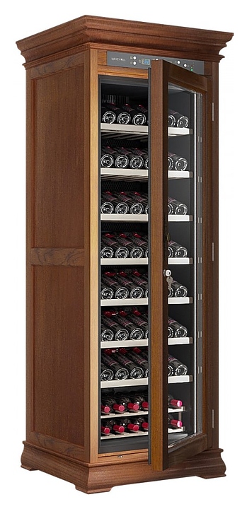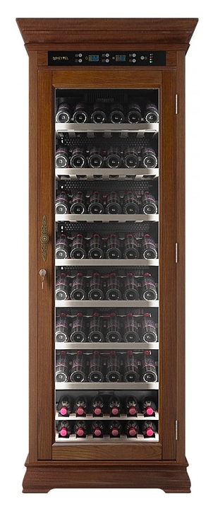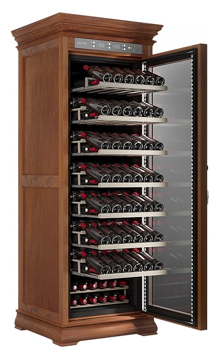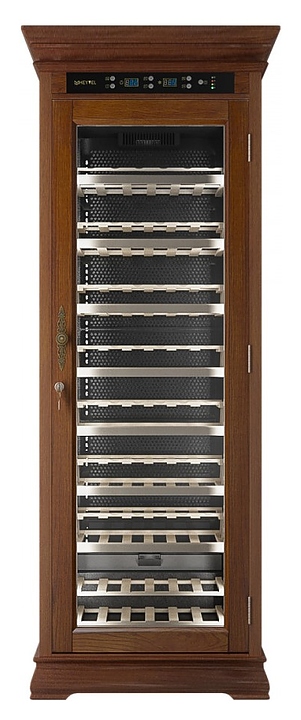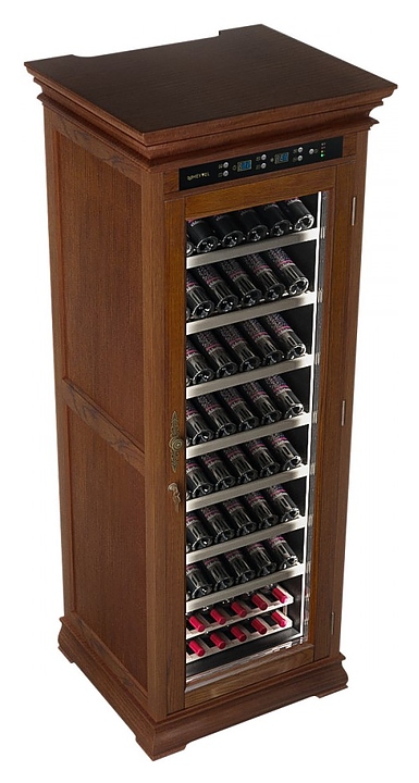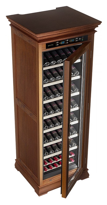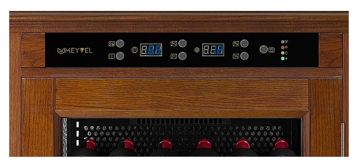 Винный шкаф MEYVEL MV108-WN1-C предназначен для демонстрации, хранения и создания оптимальных условий для сохранения всех вкусовых свойств вина в бутылках на предприятиях общественного питания, торговли, в барах, ресторанах, специализированных магазинах, частных домах или квартирах. Модель оснащена сенсорной панелью управления, электронным термостатом и светодиодной подсветкой. Корпус выполнен из обшитой деревом стали, дверь - из деревянной рамы и двойного стекла с защитой от ультрафиолетовых лучей, полки - из массива бука, ручка двери - из стали. Особенности:
