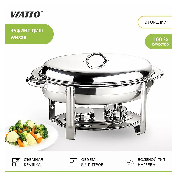 Чафинг-диш VIATTO WH836 предназначен для поддержания в горячем состоянии широкого спектра блюд на предприятиях общественного питания и торговли, а также в местах, где отсутствует доступ к электросети. Модель оснащена 1 овальной емкостью со съемной крышкой и 2 горелками. Корпус и емкость выполнены из нержавеющей стали. Дополнительные характеристики: