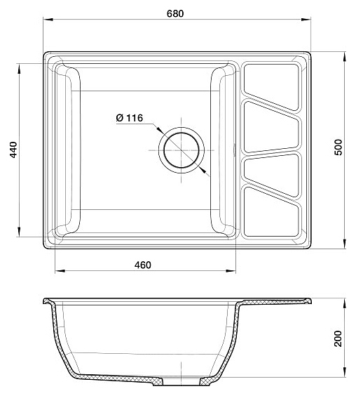 Кухонная мойка GranFest Vertex GF-V-680L предназначена для установки в частных домах, квартирах, офисах, отелях, гостиницах и на различных предприятиях для мытья столовых принадлежностей, посуды, приборов, инвентаря и продуктов питания. Модель оснащена крылом для влажной посуды. Изделие выполнено из высококачественного кварца, который устойчив к образованию пятен и воздействию высоких температур. Дополнительные характеристики:
