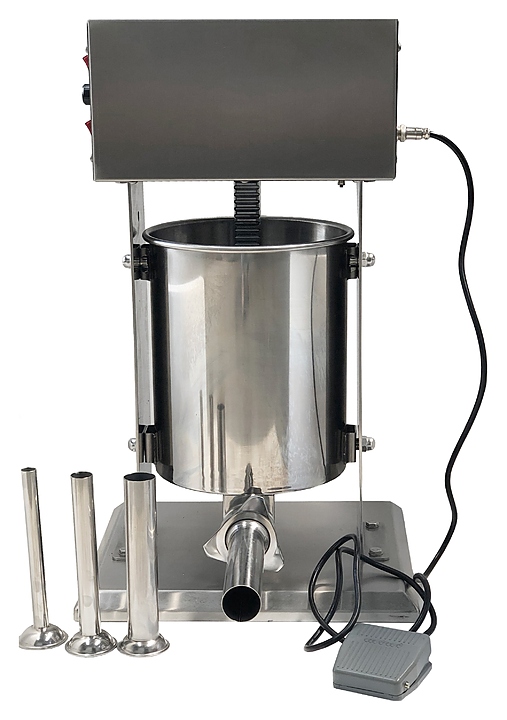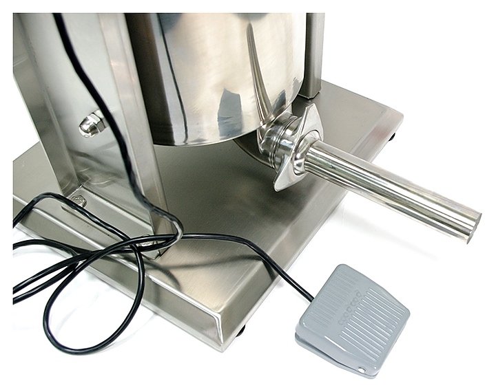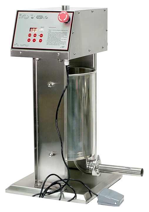Вертикальный электрический шприц для колбас Kocateq SV12GE используется на предприятиях общественного питания и торговли для изготовления купат и домашних колбас. Модель оснащена электронной панелью управления с кнопками увеличения / уменьшения скорости, опускания и поднятия поршня. Корпус выполнен из нержавеющей стали AISI 304. В комплект поставки вxодят 4 воронки-цевки из нержавеющей стали с входным диаметром 15, 22, 32, 38 мм и ножная педаль. Особенности: