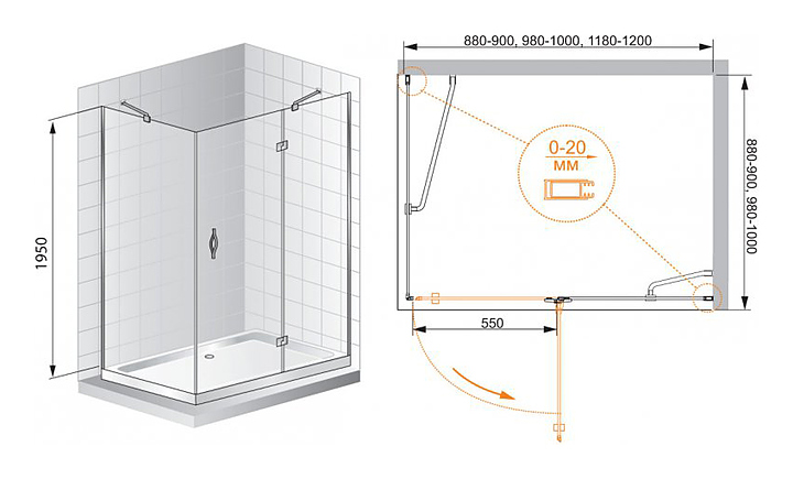 Уголок душевой CEZARES BERGAMO-W-AH-1-100/90-C-Cr-R 100х90х195 см