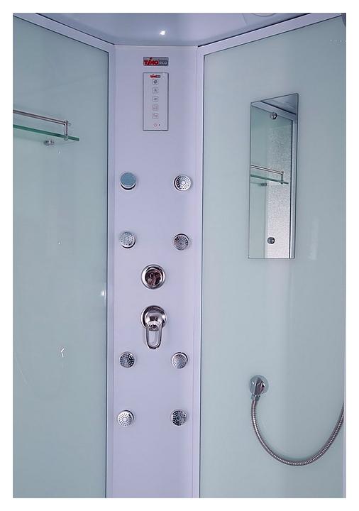 Душевая кабина TIMO ECO TE-0780 предназначена для использования в ванных комнатах. Благодаря поддону в форме четверти круга модель можно вписать даже в ванные комнаты небольшой площади. Модель оснащена крышей, высоким поддоном на усиленном металлическом каркасе, встроенным сиденьем, ручной лейкой и тропическим душем, точечным гидромассажем, сенсорной панелью управления, радио, подсветкой, полочкой, зеркалом и вентилятором. Поддон выполнен из качественного акрила, устойчивого к механическим повреждениям, обладающего высокой теплоемкостью, небольшим весом и повышенной шумоизоляцией. Особенности: