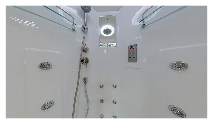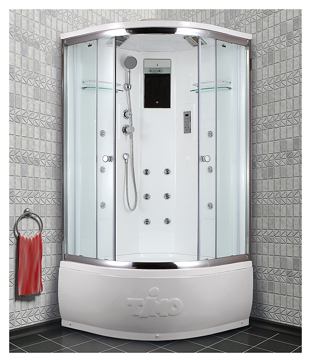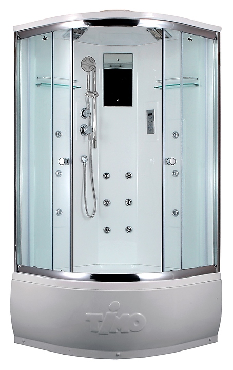 Душевая кабина TIMO Lux T-7790 предназначена для использования в ванных комнатах. Благодаря поддону в форме четверти круга модель можно вписать даже в ванные комнаты небольшой площади. Модель оснащена крышей, двумя раздвижными дверцами, высоким поддоном на усиленном металлическом каркасе, ручной лейкой с силиконовым шлангом и регулируемой по высоте штангой, тропическим верхним душем, точечным гидромассажем, сенсорной панелью управления, радио, подсветкой, двумя полочками, зеркалом, вентилятором и встроенным сиденьем. Поддон выполнен из качественного акрила, устойчивого к механическим повреждениям, обладающего высокой теплоемкостью, небольшим весом и повышенной шумоизоляцией. Особенности:
