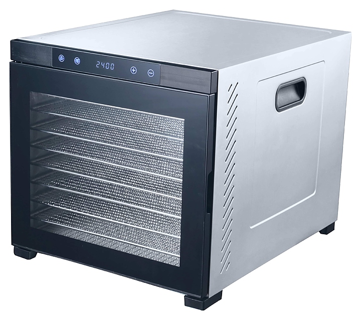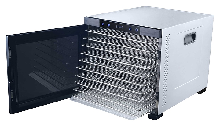 Дегидратор VIATTO VA-DG10SS предназначен для равномерного извлечения влаги из продуктов (овощей, грибов, фруктов, ягод, трав и орехов) посредством конвекции, а также для приготовления пастилы, в т.ч. фруктовой (смоквы), овощных и фруктовых чипсов, хлебцев, сушеного мяса и рыбы на предприятиях общественного питания. Сушилка оснащена электронной панелью управления и вентилятором с горизонтальным распределением воздуха, обеспечивающим равномерное просушивание продукта на всех уровнях загрузки. Модель изготовлена из нержавеющей стали AISI 430, рабочая камера выполнена из оцинкованной листовой стали. В комплект поставки входят 10 решеток из нержавеющей стали размером 395х380 мм + 1 решетка с мелкой ячейкой, + 1 пластиковый поддон для пастилы. Особенности: