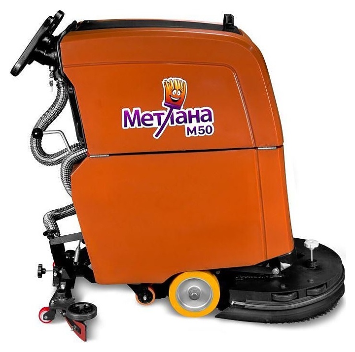 Поломоечная машина Метлана М50B увеличенная емкость предназначена для уборки различных твердых поверхностей на предприятиях и в офисах, в складских комплексах и на различных предприятиях. Модель оcнащена вакуумным мотором и мотором привода щетки, колесами на подшипниках, не оставляющими следов, моющей щеткой и водосборной балкой. Корпус выполнен из ударопрочного полиэтилена, рама-тележка из 5-ти миллиметровой стали. Комплектация: