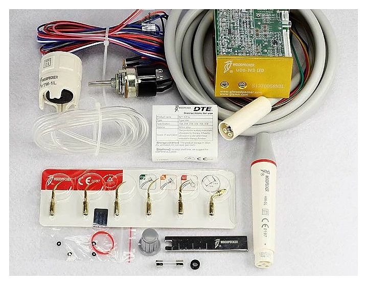 Ультразвуковой встраиваемый скайлер Woodpecker UDS-N3 с LED подсветкой наконечника используется в стоматологических кабинетах и клиниках для снятия никотинового налета, удаления зубного камня, кюретажа пародонтальных карманов, и эндодонтического лечения. Комплектация: