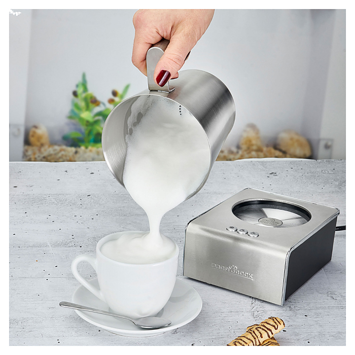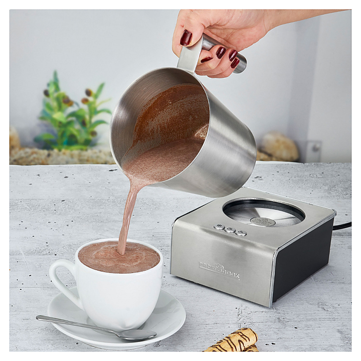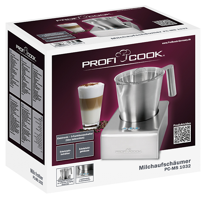 Пеновзбиватель Profi Cook PC-MS 1032 используется в частных домах и квартирах, отелях и офисах для подогрева и вспенивания молока и шоколада. Модель оснащена подставкой с 3 функциональными кнопками с подсветкой, съемной емкостью для вспенивания, 2 насадками для взбивания и перемешивания и прозрачной крышкой с защитой от брызг. Корпус и емкость выполнены из нержавеющей стали. Особенности: