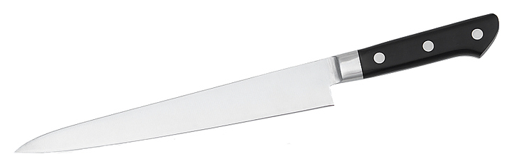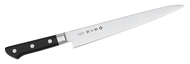 Нож для нарезки слайсер Tojiro FD-805 предназначен для тонкой нарезки на порционные кусочки в ресторанах, кафе. Лезвие выполнено из высококачественной стали VG10 + 13 Chrome Stainless Steel, нескользящая металлическая рукоять - из нержавеющей древесины. Особенности: