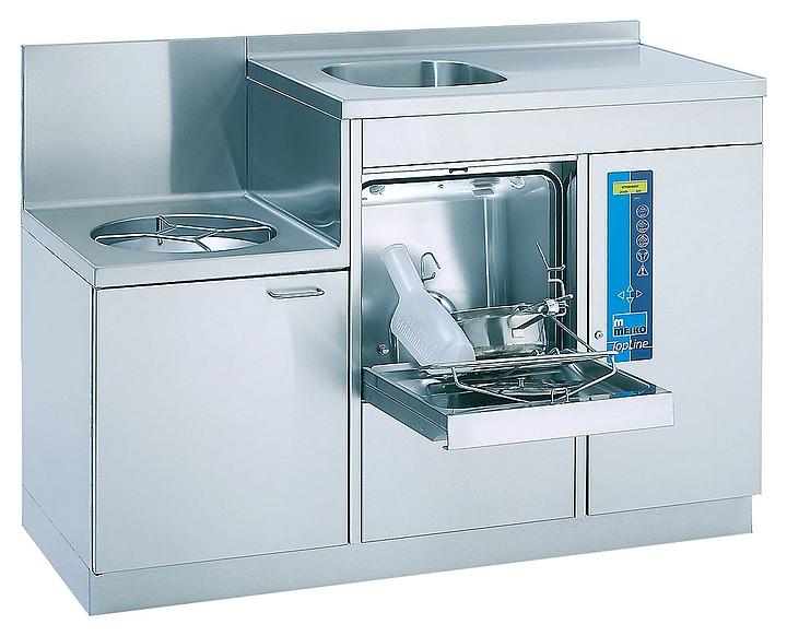 Моюще-дезинфицирующая машина Meiko SAN 14B / Topline 40 с мойкой для рук предназначена для гигиенической обработки и дезинфекции предметов ухода за больными в санаторно-профилактических, паллиативных и других медицинских учреждениях. Модель оснащена вместительной камерой с держателем и рукавом для обработки предметов, надежно блокируемой герметичной дверью, запираемыми на ключ техническими отделениями и удобной панелью управления с мембранной клавиатурой и цифровым дисплеем индикации. Корпус и облицовка камеры выполнены из нержавеющей стали. Особенности:
