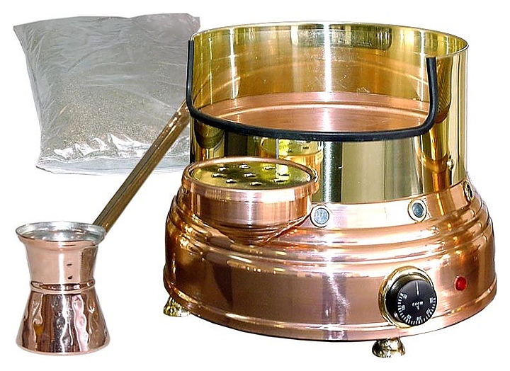 Кофе на песке JOHNY AK/8-1 используется в специализированных кофейных заведениях для приготовления кофе по-восточному (на песке). В наполненную нагретым до нужной температуры песком платформу устанавливается джезва с водой и перемолотым кофе. Равномерный прогрев, обеспечиваемый нагревательным элементом из алюминия, и медленное томление придают напитку натуральный яркий вкус и насыщенный аромат. В комплект входят 1 джезва из меди и 1 мешочек со специальным песком. Особенности:
