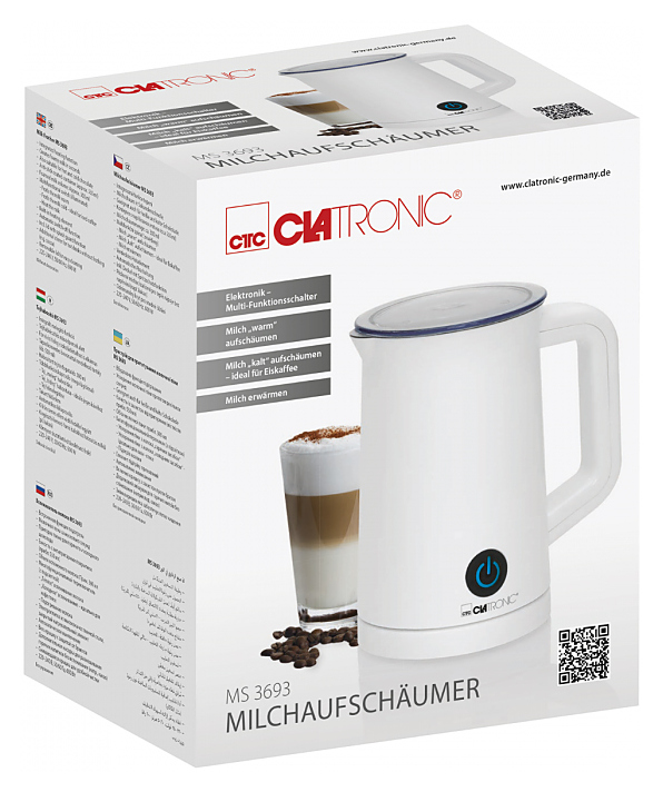 Пеновзбиватель Clatronic MS 3693 используется в частных домах и квартирах, отелях и офисах для вспенивания и нагрева молока. Модель оснащена многофункциональной кнопкой управления с подсветкой, съемной крышкой для защиты от брызг с уплотнителем, 2 насадками для вспенивания и перемешивания и емкостью с внутренним антипригарным покрытием. Особенности: